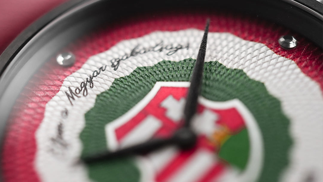 A számlap kialakítása többrétegű megoldással készült, finoman gravírozott mintázattal, amely a hagyományos magyar motívumvilág struktúrájára utal.