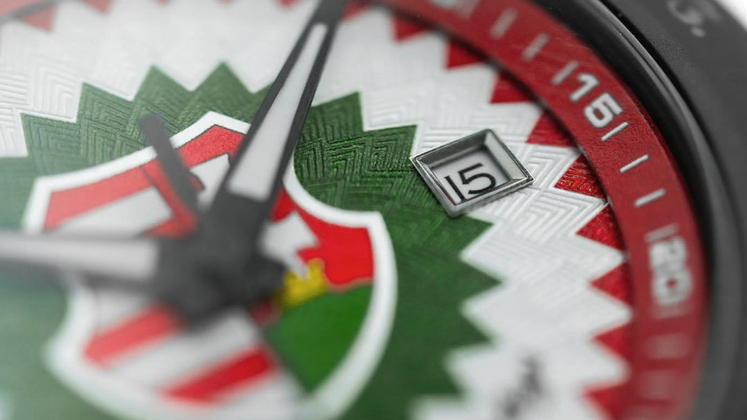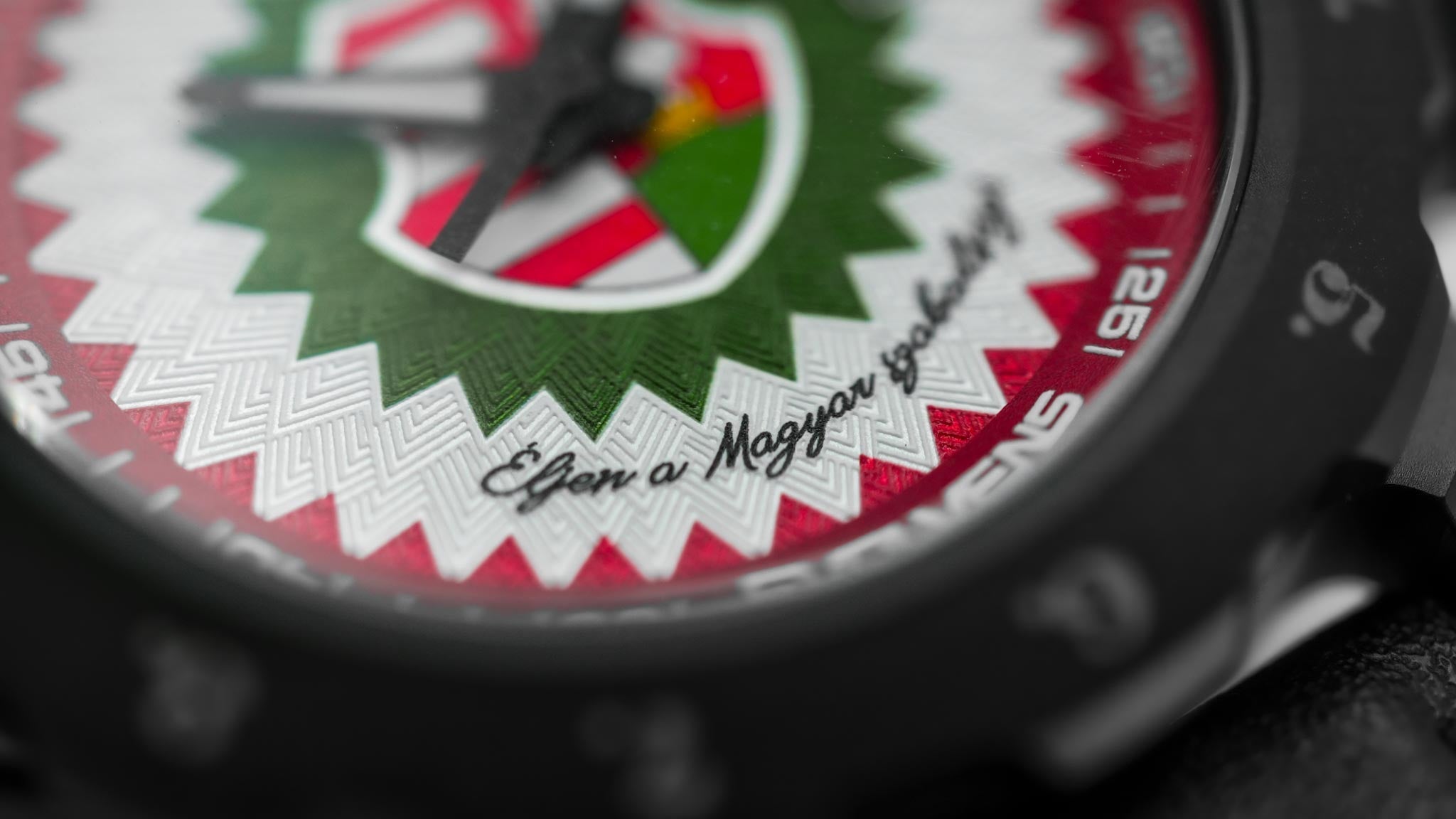 Az órák tervezése során nem egy díszítőelemekkel telezsúfolt emléktárgyat akartunk létrehozni, hanem egy karakteres, hordható szimbólumot. A piros, fehér, zöld színek struktúraként szolgálnak: texturált felületeken, mélységgel és határozott kontúrokkal.