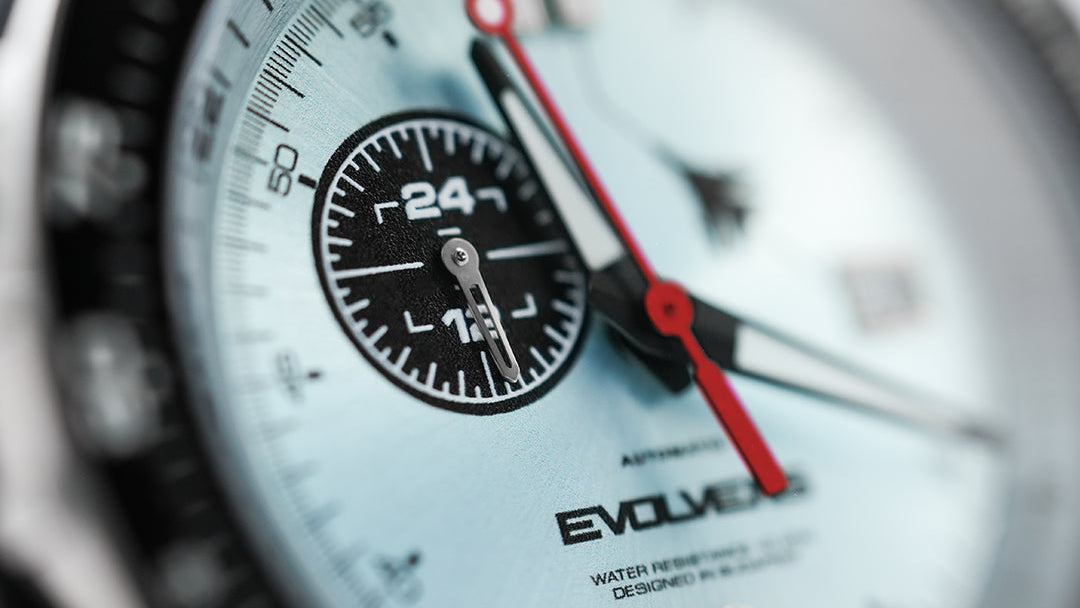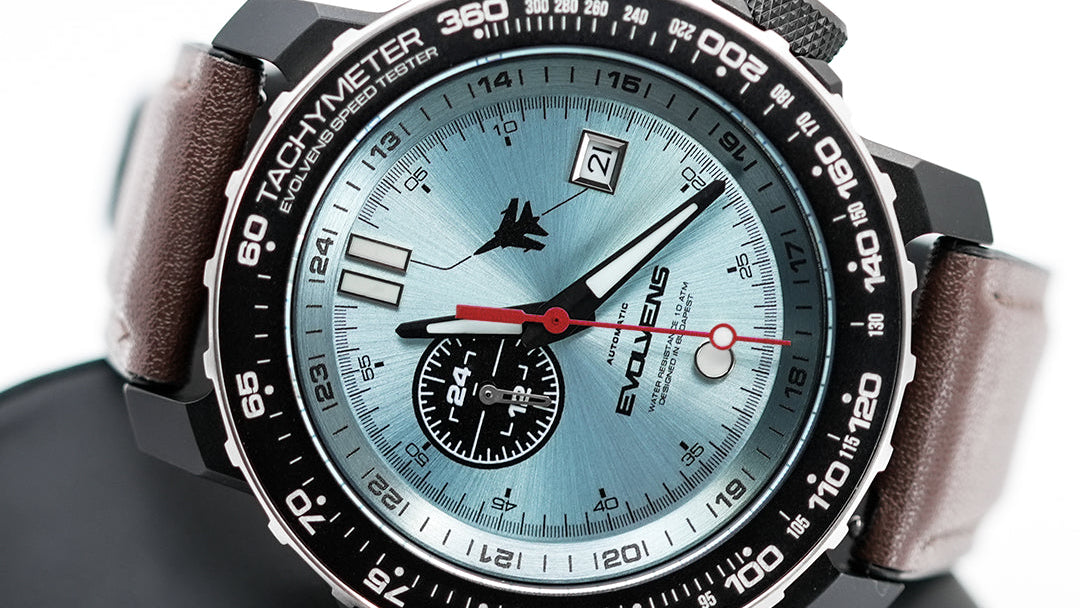 A PILOT modell részletei a repülőgép-műszerek világát idézik. A tachymeter skála, a 24 órás segédszámlap és a markáns korona mind a funkcionális tervezés irányába mutatnak. A tok geometriája erőt sugall, a lünetta karakteres, a számlap szálcsiszolt felülete pedig finoman reflektál a fényre.